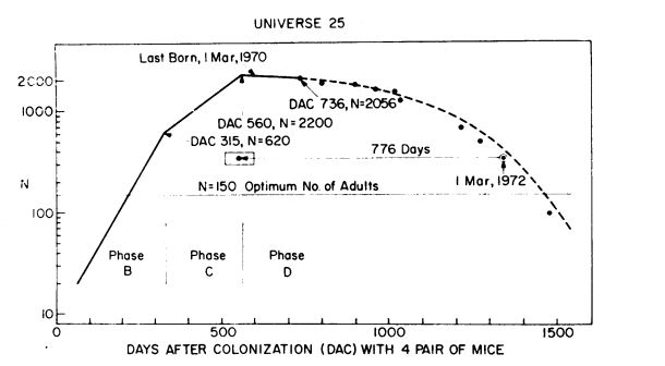 Dopo 560 giorni la natalità si fermò totalmente ai 2200 esemplari, nonostante l’Universo 25 fu concepito per ospitare un massimo di 3800 topi.